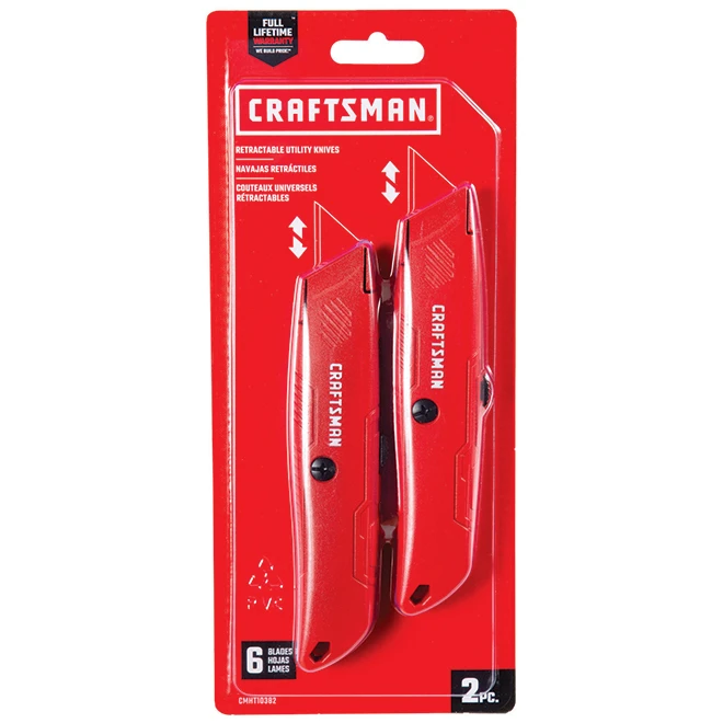 This pack of 2 Craftsman® utility knives offers a strong blade retention system, allowing for safe and efficient heavy-duty cutting, as well as a swing-out blade storage for easy access to replacement blades. The blade is retractable in 3 positions for variable cut depth. Includes 6 utility blades. This product is backed by a limited lifetime warranty.