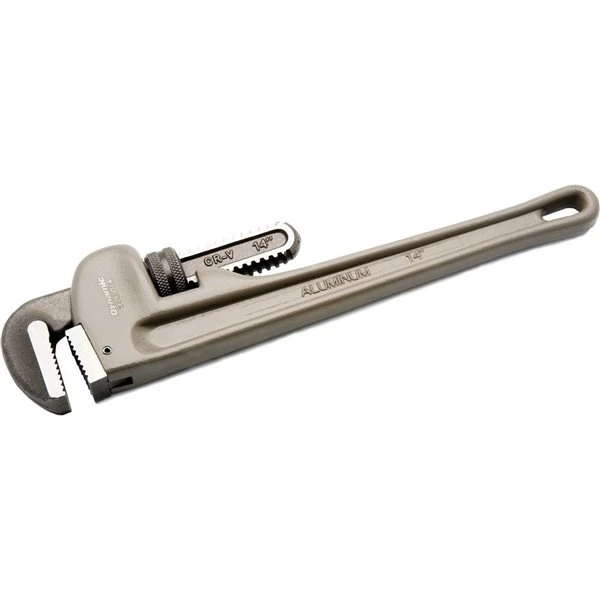 Aluminum construction and sturdy I-beam design make it up to 30% lighter than traditional cast-steel models. Sharp, deep teeth provide a secure grip on pipes and fittings.