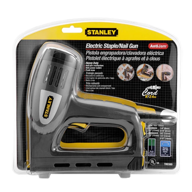 Staple gun. 8 in. (H) x 7 in. (L). Use with Stanley’s “SharpShooter TRA 700” series staples, “Arrow T-50”. Also for 1/2-in., 9/16-in. and 5/8-in. brad nails. Heavy duty design delivers outstanding driving power. Features a soft grip handle and trigger. Anti-jam mechanism. High/Low power switch. Flush nose for tight working areas. 8-ft. electrical cord.
